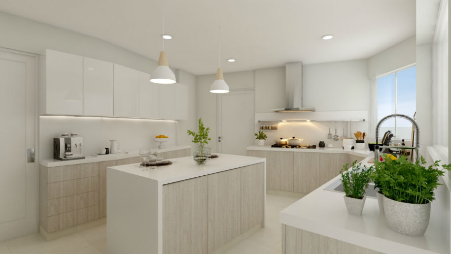 Cocinas equipadas con horno, horno microondas, campana extractora, cocina, refrigeradora y lavaplatos (todos marca BOSCH)